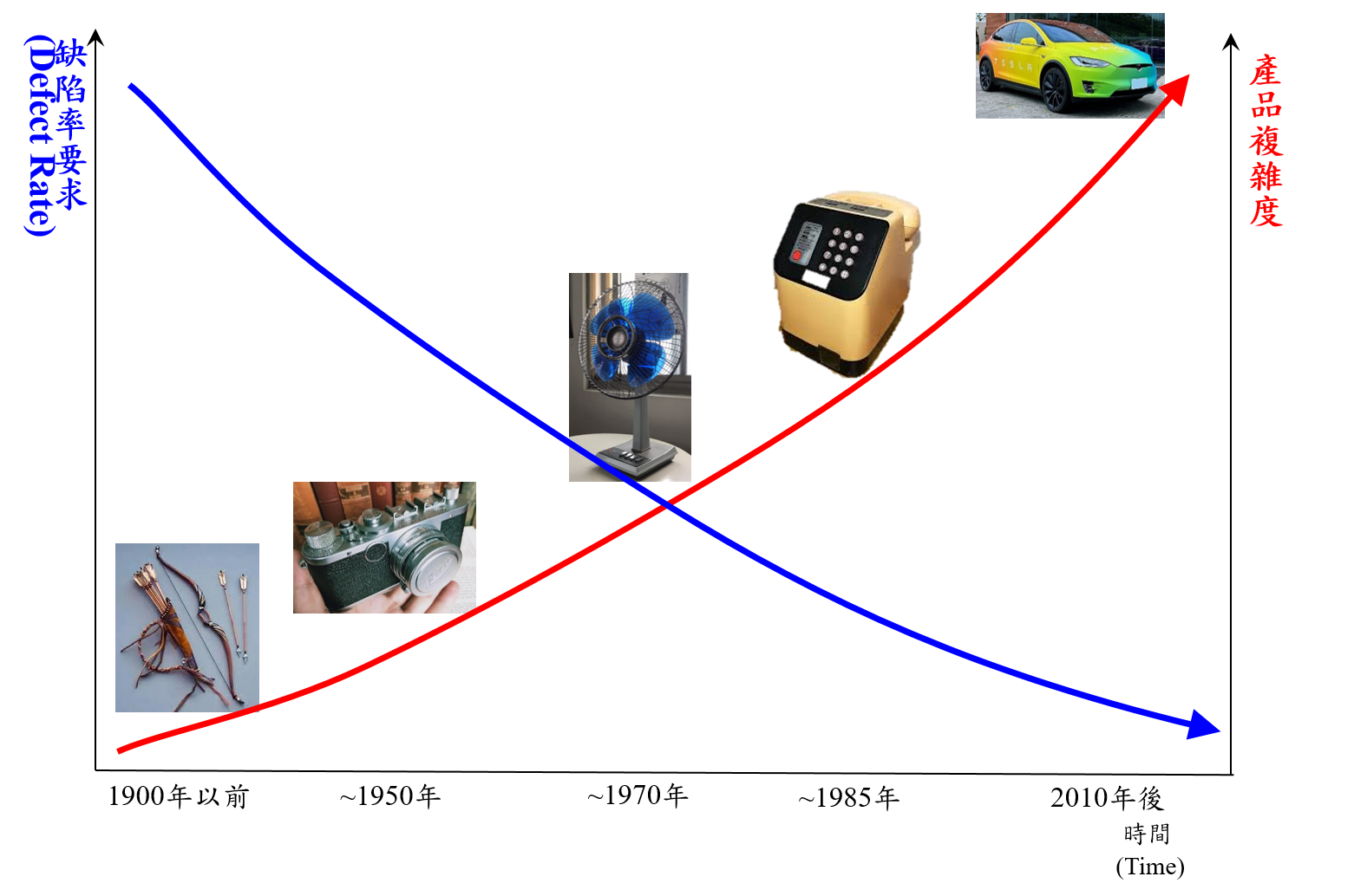 | 客戶對品質要求越來越高,規格 (Process Window) 越來越嚴 (消費性電子產品 100ppm-> 自駕車 1ppm -> ZDM) | (1)內部品質成本越來越高,實際檢驗頻率提高及 Cycle Time 變長。 (2)品質缺陷所造成的失敗成本越來越高。 |