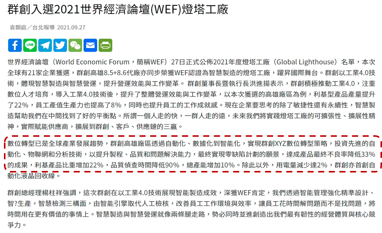 工商時報 2021/9/27 “群創入選2021世界經濟論壇(WEF)燈塔工廠” 新聞