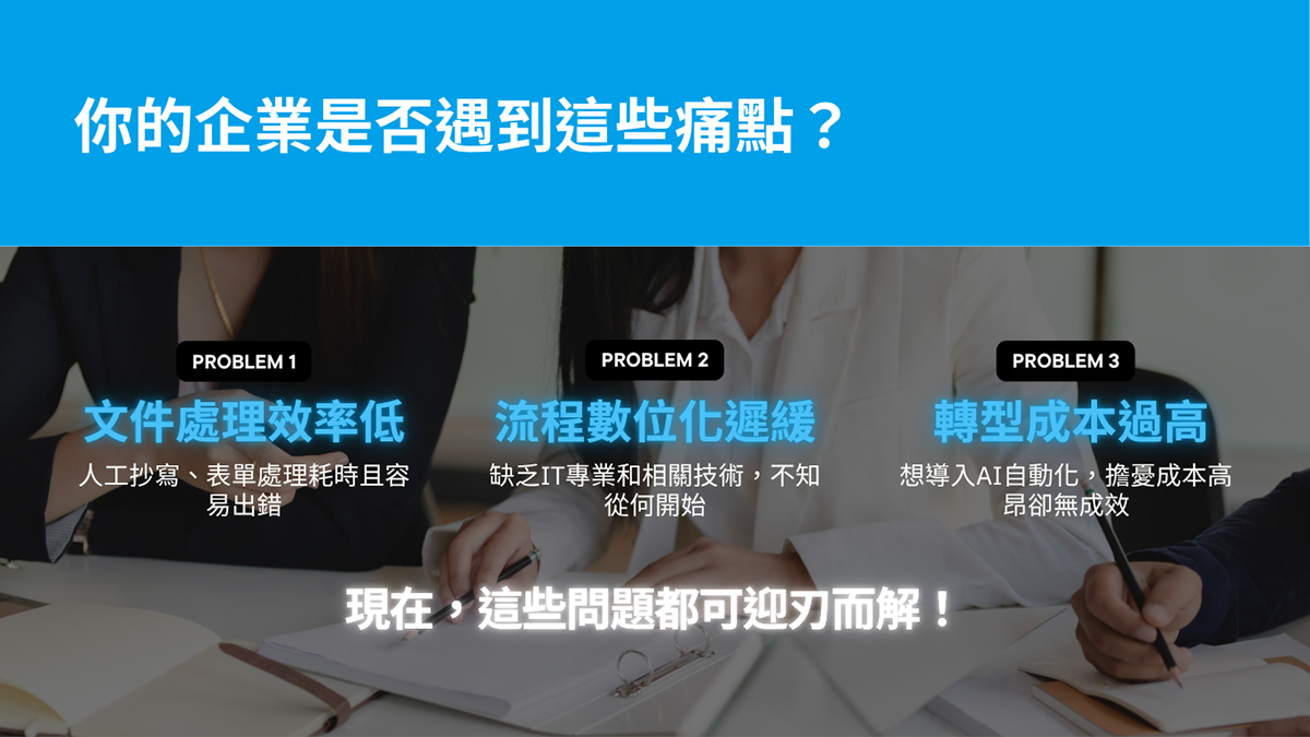 企業的日常工作流程中,可能會遇到這些情況,像是人力處理文件與表單的效率低落、想要流程數位化卻不知如何著手、想要導入AI做數位轉型卻怕成本過高還可能失敗...這些痛點,除了策略面的解方外,如果能透過實用的技術與高效的工具來逐步導入,或許問題就不會這麼大。