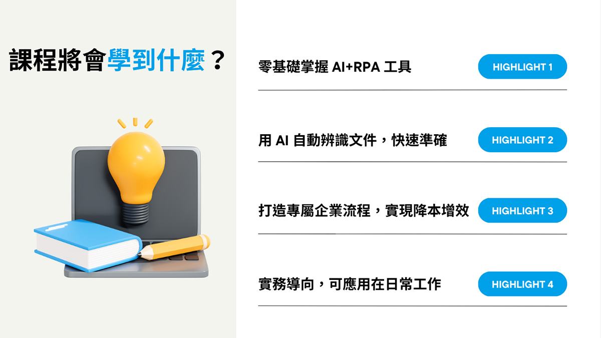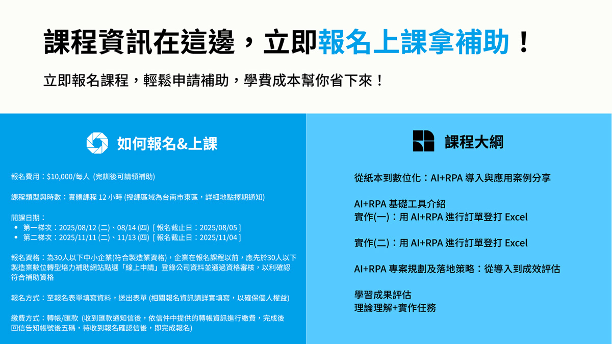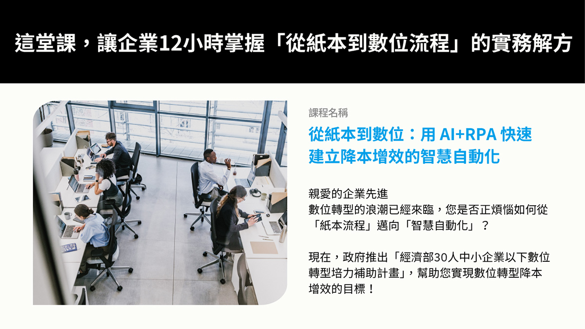 一個月後就要開課了,本課程針對企業老闆、主管、基層員工的日常工作需求量身打造,12小時內立即體驗AI+RPA的強大效益,立即報名上課拿補助吧!