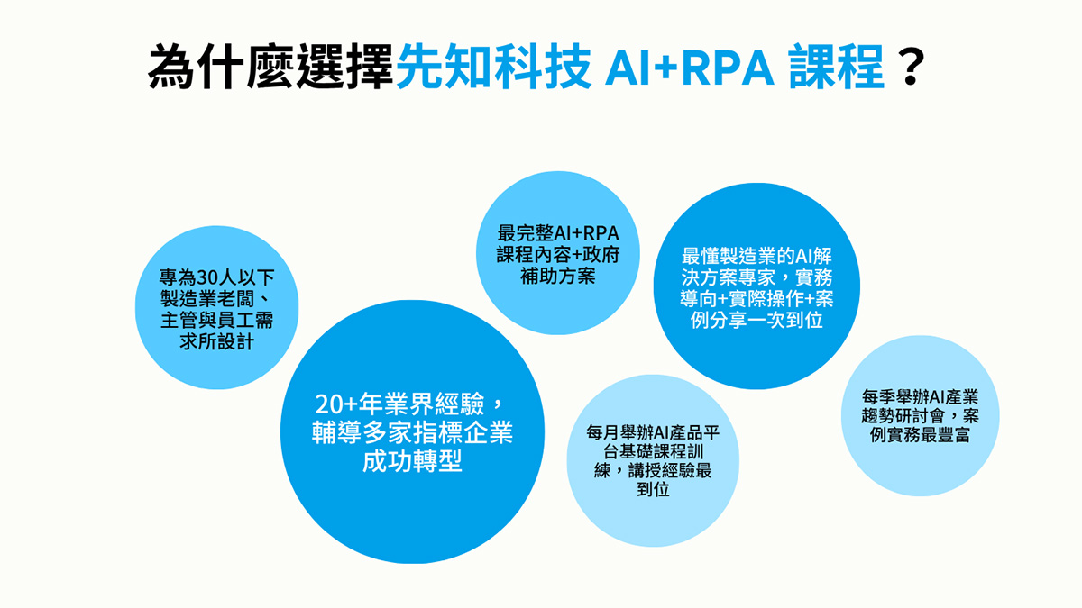 先知科技具備20+年業界經驗,輔導多家指標企業成功轉型,我們將自己定位為「最懂製造業的AI解決方案專家」,持續提供AI相關技術與智慧製造解決方案,協助客戶創造效益並推進產業發展,並長期透過課程訓練與先知論壇線上研討會,與業界專家持續交流激盪,是您在選擇AI技術相關的產品與服務、企業內訓課程與政府補助案輔導的絕佳夥伴!